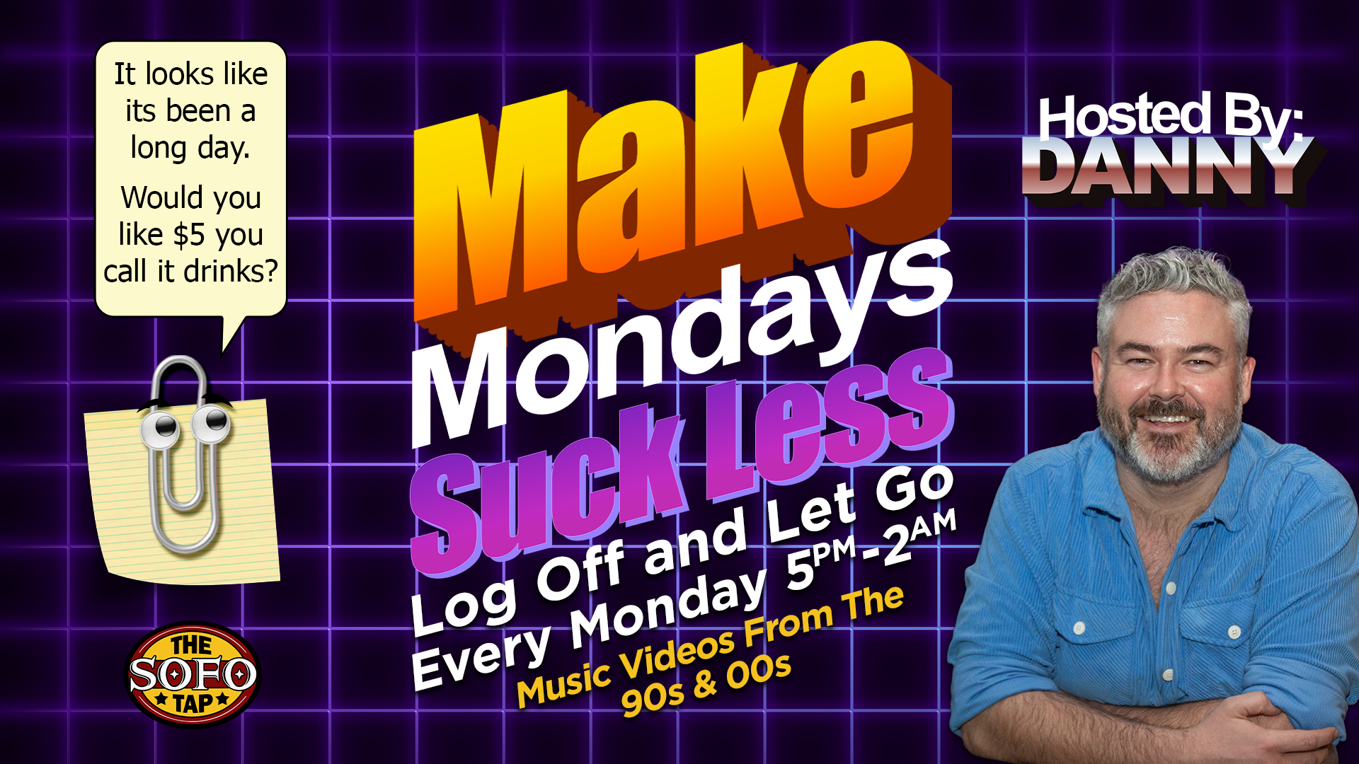 Every Monday from 5pm–close starting January 26th, 2026, Danny’s at The SoFo Tap for Make Mondays Suck Less, pouring drinks and setting the tone for the week.